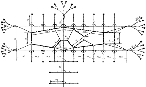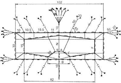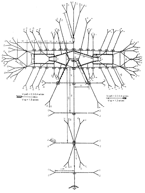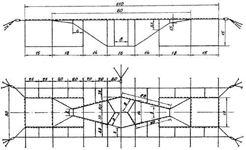 Рис. 5. Невод ставной полуподвесной с внутренними подъемными дорогами 80х18х15