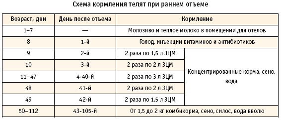 Успех раннего отъема обеспечивают несколько обязательных условий. В первые дни жизни телятам надо давать достаточное количество молозива, а потом в течение нескольких дней — цельное молоко. Самый благоприятный возраст для отъема — 8–10 суток, на следующий день телятам делают инъекцию витаминов и антибиотиков, затем — суточное голодание. После этого начинают кормить по схеме (табл. 2).