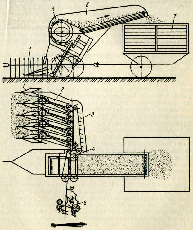 Рис. 1 - Схема льнокомбайна ЛКВ-4А: 1-делитель; 2-теребильный аппарат; 3-поперечный транспортер; 4-зажимной транспортер; 5-барабан; 6-транспортер вороха; 7-тракторный прицеп; 8-вязальный аппарат