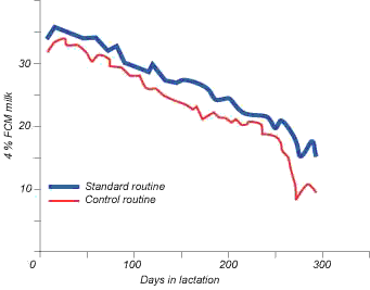 Как следует проводить обработку вымени перед доением? Экспериментально важность строгого выполнения процедуры доения была продемонстрирована с точки зрения производства молока. Был изучен процесс лактации у коров, подвергшихся разным процедурам доения. Строгое соблюдение процедур (обмыв, вытирание сосков и вымени в течение 30 секунд и размещение доильного аппарата в течение 60 секунд с начала стимуляции) привело к увеличению надоев в среднем на 450 кг за лактацию. Контрольная процедура обработки вымени перед доением осуществлялась с более коротким интервалом вытирания вымени и разным временем ожидания перед размещением на вымени доильного аппарата (см. Картинку ниже).