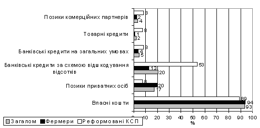 З початку 2004 року по 19 вересня українські аграрії одержали кредитів на загальну суму 3,824 млрд. грн., з яких 2,286 млрд. грн. були надані на пільгових умовах. Таким чином, сільгоспвиробниками отримано кредитів на суму, що на 23,7% перевищує заявлену річну потребу підприємств АПК у банківських кредитах. Неможливо точно сказати, яка частина цих 4 млрд. грн. отримана фермерськими господарствами, але, за різними оцінками, - від 3% до 5%, або близько 150 млн. грн., що приблизно відповідає 70 гривням на гектар, або близько 9% від середніх оцінних витрат на вирощування мало інтенсивної сільськогосподарської продукції. Ця сума може бути ще менше, якщо врахувати, що фермери вирощують переважно більше інтенсивні культури, чим великі сільськогосподарські підприємства. Тобто видно, що фермерські господарства України не дуже активно використовують кредити.