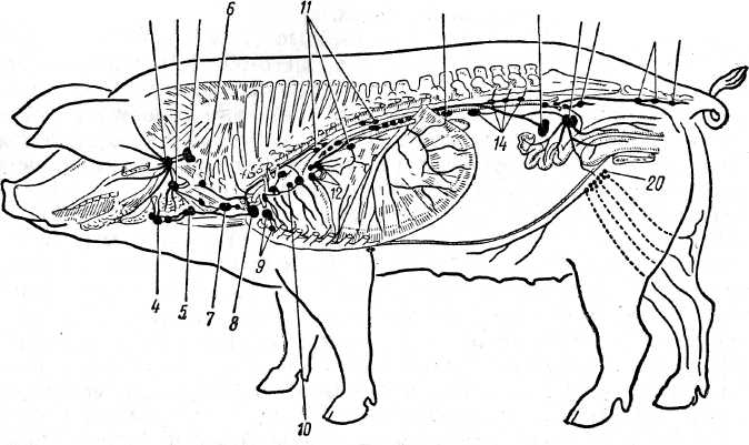 1— заглоточный медиальный узел, 2— шейный поверхностный дорсальный у.. 3 — шейный поверхностный вентральный у., 4— подчелюстной у., 5 — подчелюстной добавочный у., 6 — шейный глубокий средний у.. 7 — шейный глубокий задний у.. 8 — подмышечный узел 1-го робри. 9 — грудинный передний у., 10 — средостенные передние уу..11 — средостечные верхние уу.. 12 — левые бифуркационные уу.. 13 — почечные уу., 14 — поясничные уу., 15 — подвздошные боковые уу.. 16 — подвздошные средние уу., 17 — тазовые, или внутренние подвздошные уу., 18 — наружные крестцовые уу.. 19—ягодичные уу., 20 — паховые поверхностные, или надвыменные, уу.