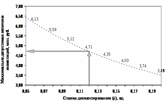 Из графика в частности видно, что величина дополнительных капиталовложений в зависимости от ставки дисконтирования может изменяться от 3,5 млн. руб. – при ставке дисконтирования i=0,2 до 6,1 млн. руб. при i=0,05. Наиболее вероятным можно считать диапазон значений, приходящихся на изменение ставки дисконтирования от 0,1 до 0,15. Для принятой в настоящее время ставки 0,12 размер допустимых дополнительных капиталовложений отражен на графике стрелками и составляет 4,71 млн. руб.