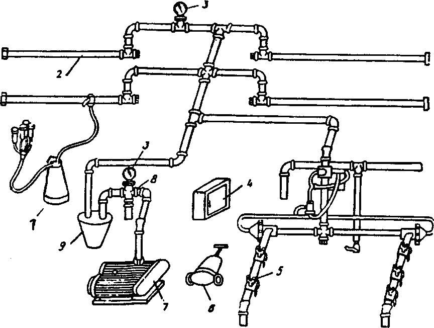 1 - доильный аппарат, 2 – вакуум-провод; 3 – вакуумметры; 4-шкаф запасных частей; 5 - устройство для промывки доильных аппаратов; 6 - тележка для перевозки фляг, 7 - вакуум-насос; 8 вакуум-регулятор; 9 – вакуум-балон.