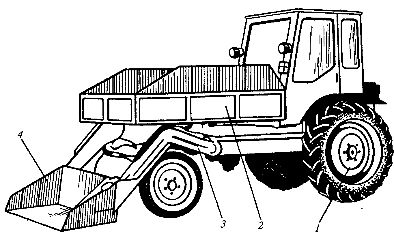 1 — самоходное шасси Т-16М; 2 — самосвальный кузов; 3 — навеска с гидроприводом; 4 — ковш