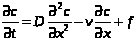 Тут c – концентація, t - час, x,y,z – координати (вісь x напрямлена вздовж потоку), Dx,Dy,Dz – коефіцієнти молекулярно-турбулентної дифузії, vx,vy,vz - складові швидкості потоку рідини, k – коефіцієнт самоочистки, f – функція подачі забруднення.