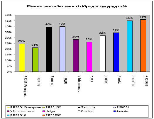 9.Всі гібриди досліду були рентабельні,рівень рентабельності склав 21-46%. Кращими за рівнем рентабельності були середньостиглі гібриди PR38R92 та