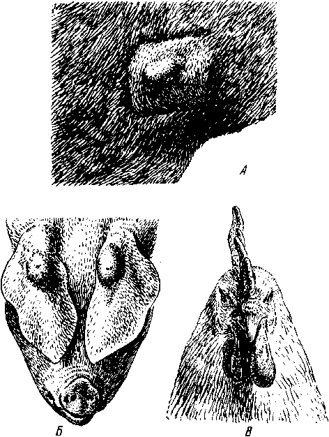 Рис. 7. Положительная реакция на туберкулин: А — у коровы; Б — свиньи; В — птицы
