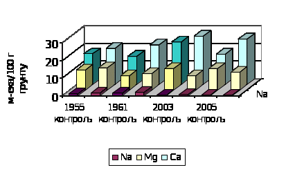 Як видно з графіка (рис.6) за 50 років сільськогосподарського використання солонців каштанових глибоких кількість загальних і токсичних солей у профілі зменшилася у двічі. Це зменшення відбулося передусім за рахунок хлоридів та сульфатів натрію. Натомість у ґрунтах спостерігається тенденція до деякого збільшення кальцію та магнію. Такі зміни у катіонному складі зумовили зростання відношення Сa:Na з 0,2-0,5у 1967 році до 4,0-5,4 у 2003-2005 роках.