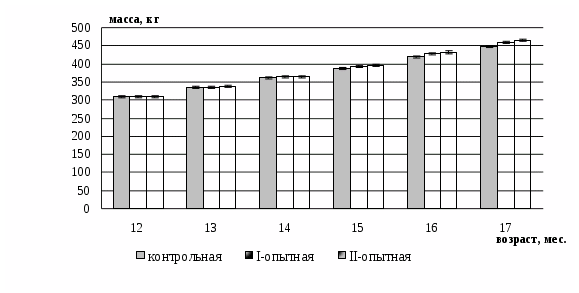 – живая масса бычков симментальской породы в возрасте 17 ти месяцев была выше в I опытной группе на 2,56 и 2,44%, во II опытной группе – на 3,45 и 3,44%, чем в контроле. Расход кормовых единиц на 1 кг прироста живой массы в опытных группах был ниже, чем в контрольном варианте, на 5,89 и 5,81% в I опытной группе, во II опытной группе – на 7,26 и 7,85%;