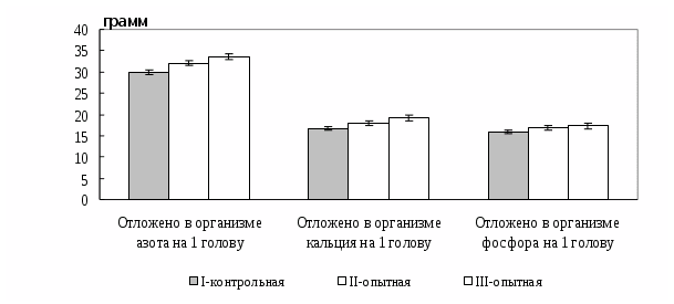 Отложение в организме фосфора было выше в опытных группах бычков симментальской породы: в I опытной группе – на 5,70 и 5,86%, во II опытной группе – на 10,13 и 13,08% по сравнению с контролем; между опытными группами разница составила 4,19 и 4,62% в пользу бычков II опытной группы.