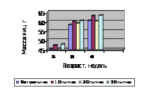 В 14-недельном возрасте весовой рост в третей опытной группе превышал весовой рост контрольной группы на 18,40%, первой опытной - на 15,3%. По развитию преимущество также осталось за третей опытной группой, где в БМД вводился соевый белок и стабилизированный йод. Так, в возрасте 10 недель у цыплят из третей опытной группы длина туловища составляла - 201,8 мм, киля - 88,7 мм, а у цыплят из контрольной группы эти показатели соответственно были равны 160,5 мм, и 89,3 мм. То же самое наблюдалось и по росту таких промеров, как ширина таза, передняя глубина туловища, длина голени и длина плюсны. Лучшее развитие внутренних органов в ходе опыта наблюдалось у подопытных цыплят. Наибольший вес внутренних органов отмечен у цыплят из первой и из третей опытных групп, получавших БМД с соевым белком и стабилизированным йодом.