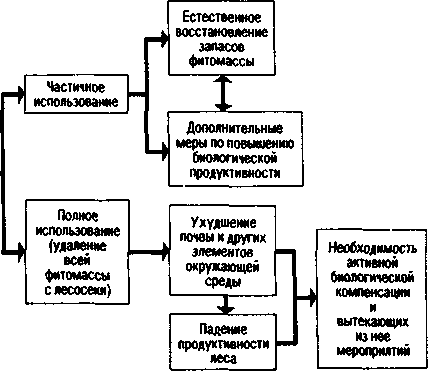 Все большее внимание стала привлекать идея использования всей фитомассы леса, включая не только стволовую часть деревьев, но и крону, корни, а также все прочие растительные компоненты леса (подлесок, напочвенный покров и пр.). Возникает необходимость учета размеров извлекаемой из леса органической массы и возможных потерь в виде обеднения почвы и других проявлений ухудшения окружающей среды, которые могут не только снизить продуктивность будущих лесов, но сказаться неблагоприятно и на его защитной роли, ряде других важных сторон леса как экологического фактора. Важно предвидеть необходимость своевременного возмещения возможных биологических и экологических потерь. Наука должна готовиться к разрешению противоречий между полным использованием леса (как биогеоценоза или экосистемы) и биолого-экологическими потерями, вызываемыми этим использованием, речь идет о сбалансированном использовании и воспроизводстве леса, быстрейшем восстановлении экологического равновесия.