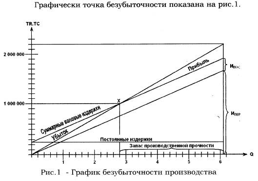 Анализ безубыточности производства оценивается по определению точки безубыточности, то есть установление того минимального объема выпускаемой продукции, при котором доход от продажи равен издержкам на производство. Точка безубыточности выражается равенством произведения цены продажи (Ц) единицы продукции на количество проданных единиц (X), и суммы переменных издержек (Ипер) на весь объем производства плюс удельные постоянные расходы (Ипос), умноженные на количество проданных единиц продукции (X), то есть: