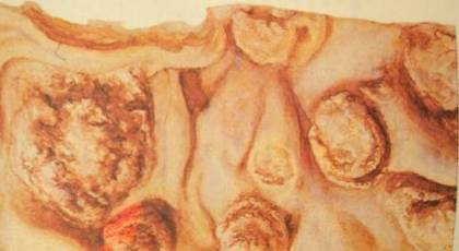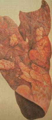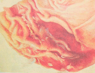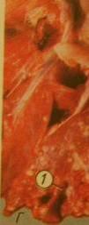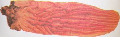 Отёчная форма: обширные восп. отёки в подкож. клетчатке и межмыш. ткани, чаще в области головы, шеи, реже-заднепрох. отв., наруж. пол. органов, на конечностях. Особенно выражен отёк в области глотки и межчел. простр., кот. перех. на гортань, уздечку языка, язык и подгрудок; язак увелич., свисает наружу. Грудная форма; крупозная, крупозно-некротизир. пневмония, фибрин. плеврит (диффузный или очаговый), уклон к некротизир. пневмонии. Бронхиал. и медиастинальные л/у увеличены, сочные, с кровоизл., серозно-фибринозный плеврит, реже перикардит и перитонит. Кишечная форма: чаще у молодняка, острый катаральный энтерит. Острая форма: точечные и пятнистые кровоизл. на слиз. киш. и лёгких, сероз. покровах, кровоизл. на эпикарде, застой крови и точеч. кровоизл. в 12-ти перст. киш., в брюш. полости-фибриноз. экссуд., При сальмонеллезе: в печени сальмонеллёзные узелки, септическая селезёнка и характерное поражение пищеварительных ораганов. |