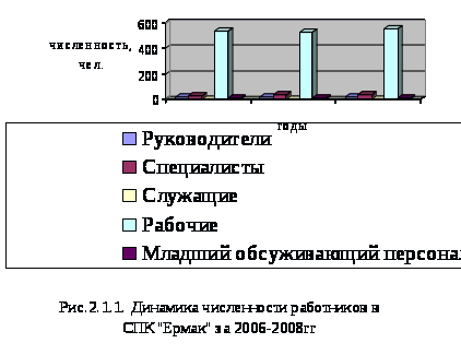 Важной задачей анализа является контроль за использованием рабочей силы, рациональной расстановки работников по участкам производства, цехам, уровнем квалификации работников. Динамика численности работников СПК «Ермак» приведена в таблице 2.1.1. и наглядно представлена на рисунке 2.1.1.