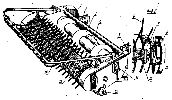 На рамі 1 підбирача (рис. 3) змонтовані підбираючі барабан, 13, шнек 3, притискне пристосування 14, механізм передачі. На вал підбираю чого барабана насаджені диски 7, у яких закріплені граблини 10 із пружинними зубами 6.