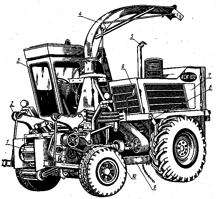 1 – подрібнюючий апарат; 2 – механізм навішення; 3 – кабіна; 4 – силосопровід;