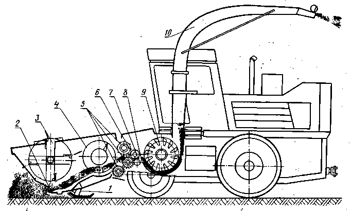 Самохідний подрібнювач (рис. 1) змонтований на рамі 9, підтримуваної мостами провідних і керованих коліс. На рамі самохідного подрібнювача змонтований подрібнюючий апарат, складений з живильного і подрібнюю чого пристроїв.