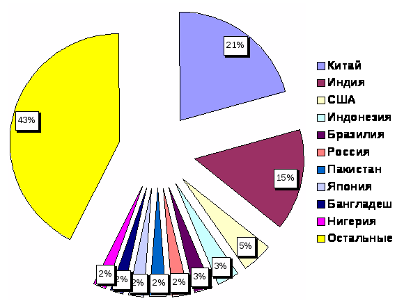 I. ПРИЧИНЫ ПРОДОВОЛЬСТВЕННЫХ ТРУДНОСТЕЙ Основополагающей причиной масштабных продовольственных трудностей, наблюдаемых на протяжении последних десятилетий, стали структурные внутренние диспропорции в национальных системах продовольственного обеспечения в развивающихся странах. Отсюда в итоге наличие «ножниц» между рыночным спросом и предложением на главные продукты питания. Весомая роль в данном процессе принадлежит урбанизации. Именно она в первую очередь определяет формирование новых стандартов продовольственного потребления и вызывает сдвиги в структуре питания в пользу «интернациональных» продуктов. Международное звучание продовольственной проблеме придает и то обстоятельство, что ее прочного решения невозможно достичь изолированными усилиями отдельных стран, от которых требуется хорошо налаженное сотрудничество вне зависимости от господствующих в них общественных и политических систем. К ней нельзя подходить также в отрыве от других сложных ситуаций глобального размаха, с которыми вынуждено сталкиваться человечество. В настоящее время в мире, видимо, нет государства, в котором производство, распределение и внешняя торговля продовольствием не были бы серьезной заботой центральных властей. И в этом отношении рассматриваемая проблема тоже выступает поистине планетарной, несмотря на то, что одни страны сталкиваются с хроническим недостатком продуктов питания, в других текущей целью стало качественное улучшение пищевого рациона с тем, чтобы приблизить его к научно обоснованным нормам, а некоторые вынуждены даже «бороться» с излишками производимых продуктов и вызываемыми их избыточным потреблением болезнями населения. Диаграмма 1 Численность населения крупнейших стран мира. Многовековой опыт свидетельствует, что проблема питания представляет собой синтетическое явление, которое не замкнуто рамками только общественного воспроизводства и требует более широких подходов. Нехватка продуктов питания сопровождала человечество на всем протяжении его истории. В мифологии индейцев Центральной Америки существовало божество голода, а благодаря текстам Кодексов майя и священным книгам древних обитателей региона, сказаниям, ритуалам, сакральной религиозной символике мы можем судить о той выдающейся роли, которая принадлежала его главной продовольственной культуре – кукурузе. В греческой мифологии уже первая женщина, созданная богами-олимпийцами, - Пандора, открыв врученный ими сосуд, выпустила на волю заключенные в нем людские пороки и несчастья, среди которых был и голод, расползшийся по всей Земле. Если же обратиться к более близким событиям, то вплоть до XIV-XV вв. голод многократно косил миллионы людей, учитывая, что за ним следовали всякого рода эпидемии (голодный тиф) и другие заболевания, вызывавшие массовую гибель людей. В Англии, например, в 1005-1322 гг. было зафиксировано 36 подобных голодных эпидемий. Лишь в эпоху позднего средневековья нехватка продуктов питания в европейских странах начинает ослабевать: наблюдавшееся развитие торговли, налаживание хранения зерна, совершенствование транспорта – все это облегчало участь населения в неурожайные годы и частично спасало от преждевременной смерти. Однако тенденция явного, принципиального оздоровления ситуации распространилась только на о