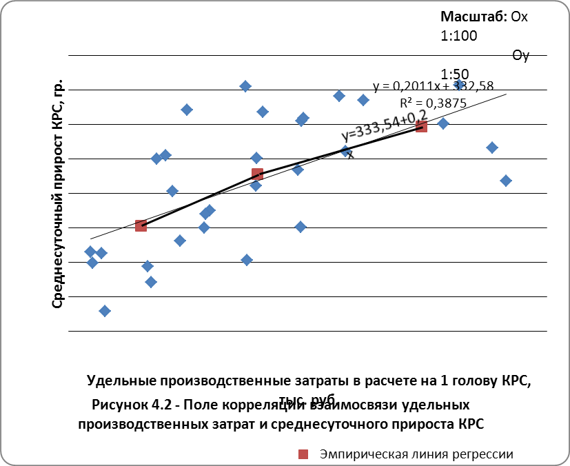 Из уравнения видно, что увеличение удельных производственных затрат на 1 голову на 1 тысячу рублей вызовет увеличение среднего суточного прироста живой массы КРС на 0,2 грамма. Это свидетельствует о существенном влиянии удельных производственных затрат на средний суточный прирост живой массы КРС. Изобразим связь на графике (рисунок 4.2).