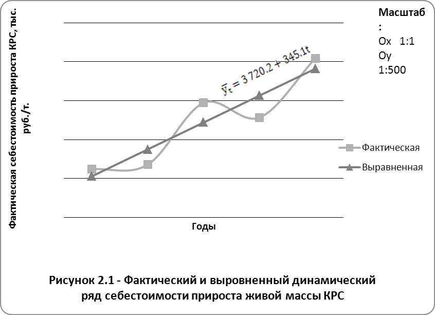 Как видно из таблицы 2.1 себестоимость 1 тонны прироста живой массы КРС планомерно возрастала и в среднем за пятилетие составила 3 692 тыс. руб./т. Средний абсолютный прирост составил 355,8 тыс. руб./т. В процентном выражении это 9,8 %. При увеличении себестоимости прироста живой массы КРС на 1%, в абсолютном значении она вырастет на 36,1 тыс. руб./т.