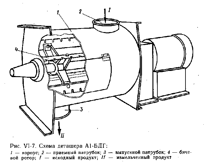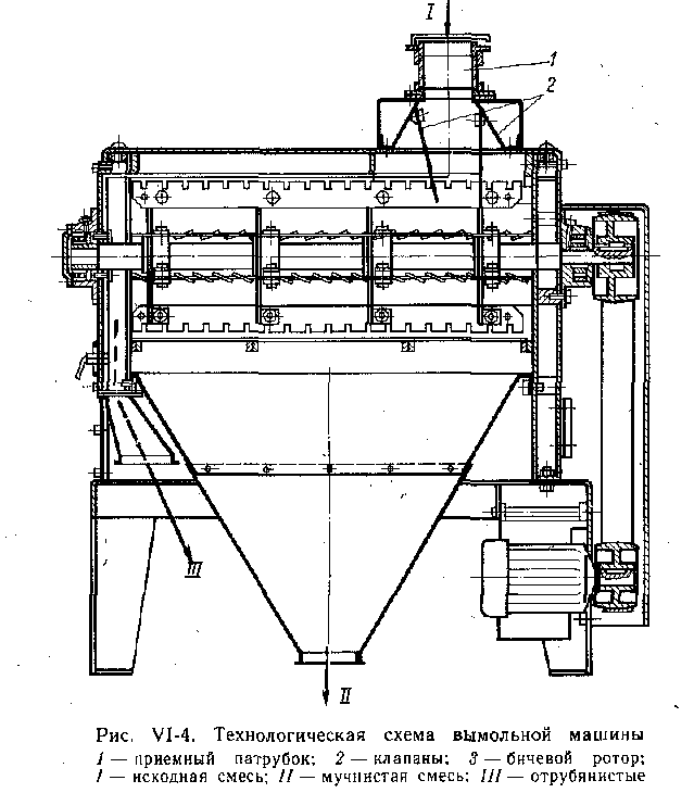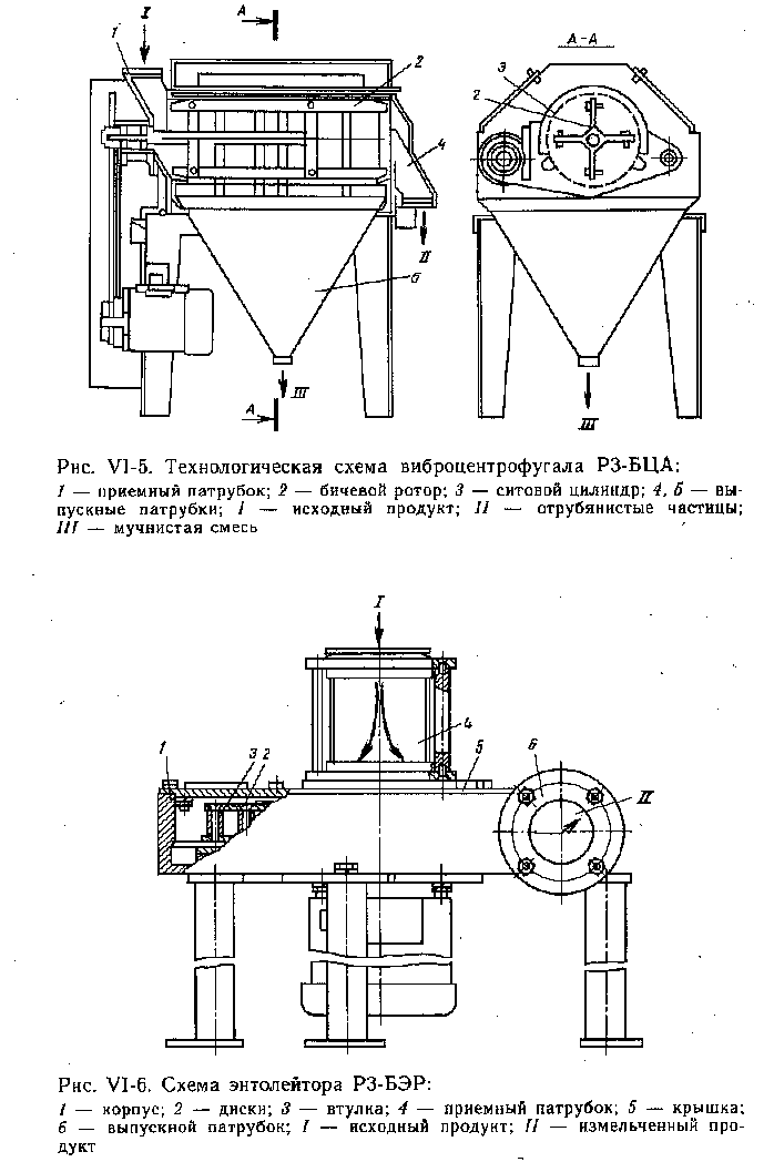 На различных этапах производства муки наряду с основным измельчением и сортированием используют вспомогательные операции в машинах ударно-истирающего действия: вымольная машина Al-БВГ (рис. VI-4) , энталейтор РЗ-БЭР, деташер А1-БДГ, виброцентрофугал РЗ-БЦА. Как правило, такие машины устанавливают после основных, они функционально связаны с последующими технологическими операциями.