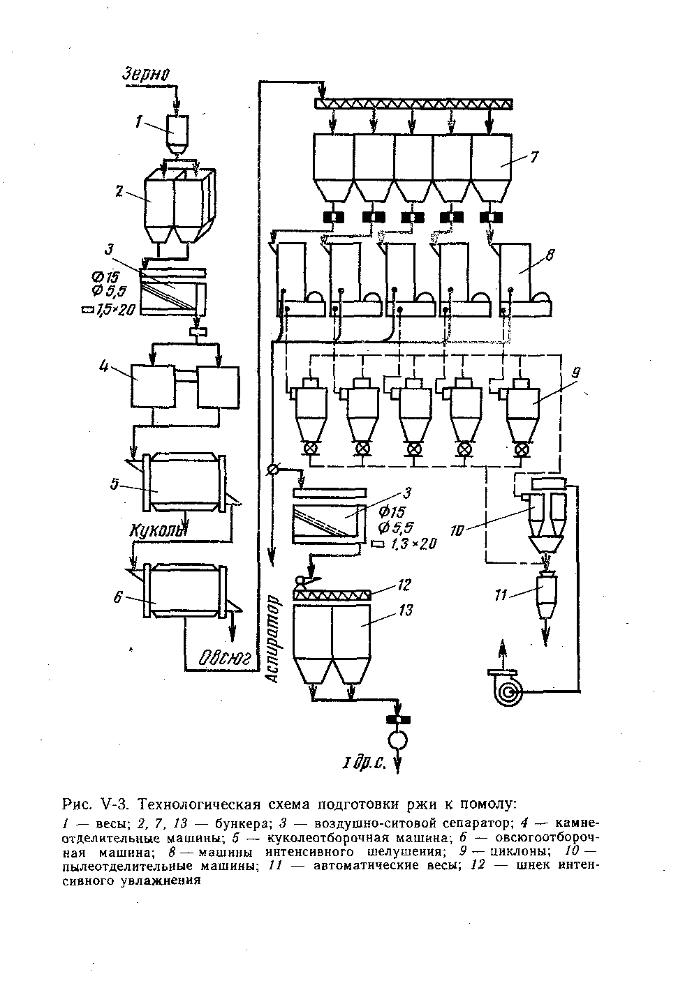 Подготовка зерна к переработке. Схема очистки зерна от примесей довольно проста, включает две системы се парирования в воздушно-ситовых сепараторах и камнеотделительную машину (рис. XII1-17). Зерно подвергают гидротермической обработке, которая способствует лучшему отделению плодовых оболочек и особенно зародыша.