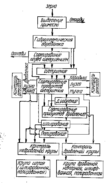Схема подготовки, которая являлась бы универсальной для всех крупяных культур, не может быть разработана, так как зерно разных культур отличается размерами, формой, наличием разных примесей и т. д. В то же время принципиальная схема подготовки зерна крупяных культур определяет наиболее целесообразную последовательность технологических операций. Для длительной устойчивой работы технологического оборудования на крупяном заводе предусмотрены бункера для неочищенного зерна вместимостью, позволяющей обеспечить работу предприятия в течение 24...36 ч. Количество зерна, направляемого в переработку, учитывают в автоматических весах.