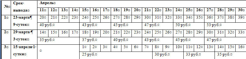 Из приведенных ниже таблиц 1 и 2 видно, что закладка яиц на инкубацию поизводится каждые 8 –10 дней, у молодняка в зависимости от возраста изменяется и цена: 1-6дней - 25 рублей, 7-9 – 27 руб., 10-13 – 30 руб., 14-15 – 32 руб., 16-17 35 руб., 18-19 – 37 руб., 20-21 – 40 руб., 22-23 – 42 руб., 24-25 – 45 руб., 26-27 – 47 руб., 28-30 – 50 руб., 31-33 – 52 руб., 34-35 – 55руб.