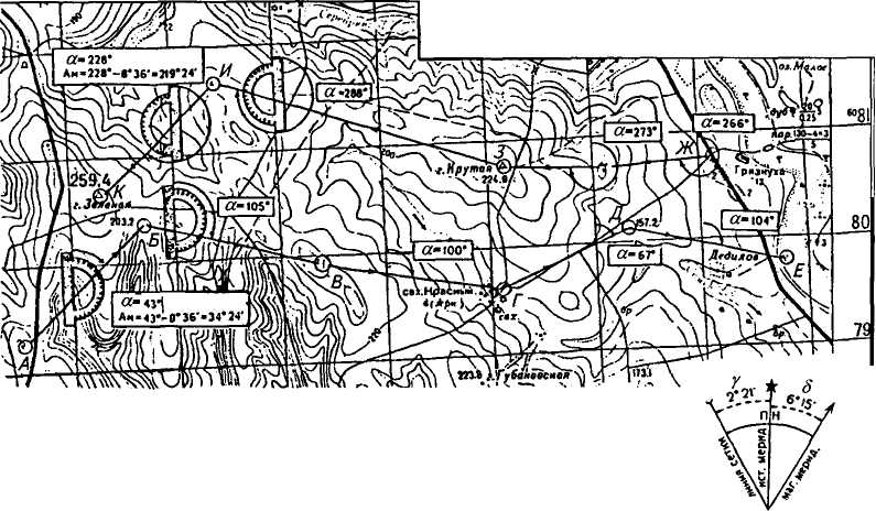 На рисунке 1 направления АБ, ..., ДЕ— прямые. Для них дирекционные углы α измеряют, а магнитные азимуты А>М> вычисляют аналогично направлению АБ. Направления Е, ИК — обратные, поэтому дирекционный угол измеряют так, как для направления ИК.