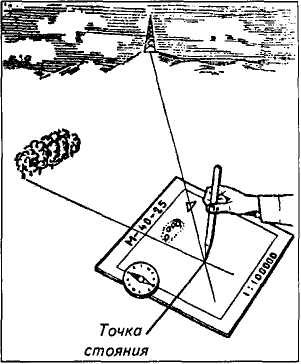 Кроме того, визирование можно выполнять по карандашу, расположенному вертикально (рис. 3, б). Карту ориентируют и поднимают на высоту плеч. Карандаш ставят отвесно на условный знак ориентира и через него визируют на предмет. Затем, не изменяя положения глаза и карты, медленно передвигают карандаш на себя — он прочертит направление от предмета к точке стояния.