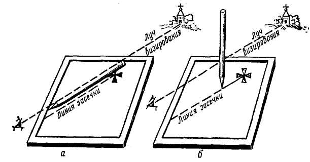 Рис. 3. Визирование по карандашу: а— карандаш наложен на карту; 6— карандаш расположен вертикально