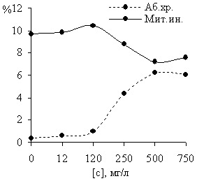Проводили сравнительные цитогенетические исследования количественных и качественных закономерностей действия гербицидов трефлан (2,6 – динитро-4 – (трифторметил) – N, N-дипропиланилин) и зенкор (4-амино-6-трет-бутил-3-метилтио – 1,2,4 – триазинон-5).