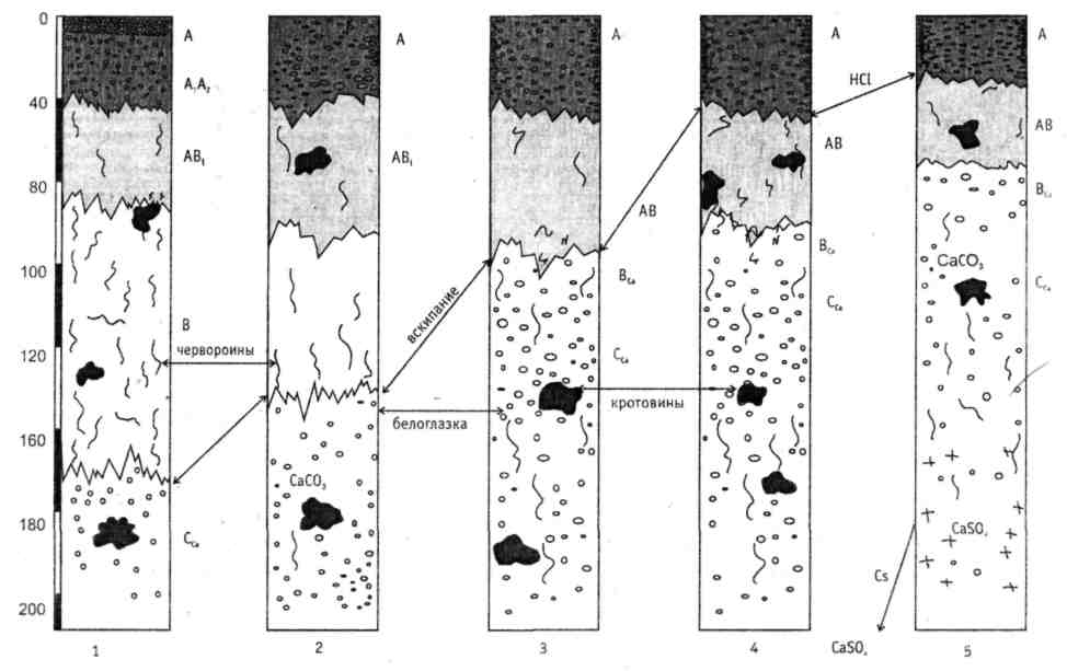 Главный генетический почвообразующий результат выщелачивания - формирование карбонатного профиля чернозема. Это карбонатный иллювиально десуктивный горизонт В>Са> (С>Са>), образующийся ниже гумусовых горизонтов А+АВ. Процессы выщелачивания сопровождаются растворением СаС0>3>, переходом карбоната кальция в бикарбонат Са(НС0>3>)>2> и дальнейшим осаждением извести в форме мучнистых скоплений СаС0>3> (белоглазки) и твердых конкреций (журавчиков). Содержание СаС0>3> здесь достигает 12 - 15%. Выше этого горизонта и глубже количество СаС0>3> снижается.