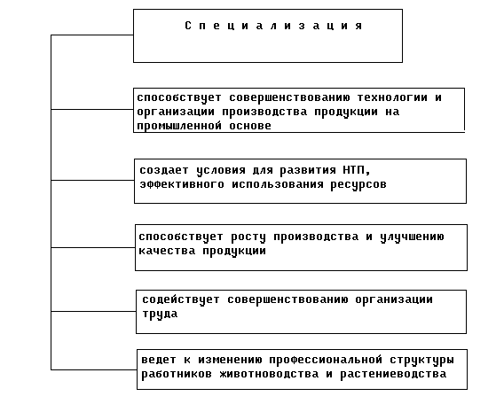 Планомерное осуществление специализации, дальнейшая концентрация производства на основе межхозяйственной кооперации, как правило, сопровождаются ростом экономической эффективности, снижением себестоимости продукции и повышением производительности труда. Основным экономическим показателем, характеризующим специализацию, является структура товарной продукции сельского хозяйства и, прежде всего, удельный вес продукции главной отрасли, отражающий уровень специализации. В специализированных предприятиях по производству молока удельный вес коров в стаде должен достигать в среднем 60-65 %. Создание специализированных молочных хозяйств тесно связано с внутрихозяйственной специализацией, организацией бригад по производству молока. Экономическое значение и рациональность специализации представим в виде рис. 1.