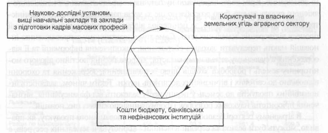 Разом із тим можливості генезису новітніх досягнень науки і техніки науковими інститутами, а також їх практичне запровадження нині гальмуються, насамперед, через відсутність у більшості з них фінансових ресурсів, оскільки інноваційний процес стане дійовим лише завдяки його адекватному забезпеченню грошовими ресурсами. Аналіз забезпеченості коштами наукових інституцій та суб'єктів володіння й користування земельними ресурсами в аграрному секторі засвідчує, що у своїй абсолютній більшості ні перші, ні другі не мають достатнього обсягу фінансів для генезису наукового продукту та його прикладного запровадження. У цьому зв'язку виникає потреба в пошуку зовнішніх джерел фінансування, серед яких можуть бути бюджетні кошти відповідних рівнів, грошові ресурси банківських та небанківських інституцій. У Карпатському макрорегіоні певною сумою коштів нині володіє населення. Воно накопичило ці ресурси, працюючи тривалий час за межами України в окремих країнах Європи, Азії та в Росії. Безперечно, що за відповідних умов люди можуть вкласти власні заощадження в розробку і запровадження інноваційних продуктів не лише для власних, а й для суспільних потреб. Інноваційне забезпечення процесу відтворення земель в аграрному секторі Карпатського макрорегіону умовно можна подати як трикутник, в якому органічно поєднуються інтереси трьох сторін: наукових інституцій як продуцентів інноватики, споживачів, які здійснюють практичне запровадження досягнень науки у відтворювальний процес земельних ресурсів, і потенційні інвестори інноваційного процесу (рис.1).