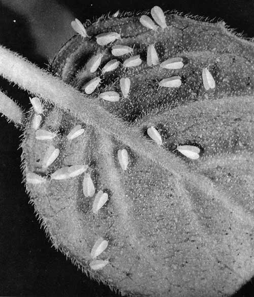 Белокрылка - Это мелкая белая мошка, хорошо заметная невооруженным глазом. Зеленоватые личинки расселяются на нижней стороне листьев, высасывают клеточный сок и оставляют сахаристые выделения. На листьях появляются слабо заметные белесые или желтоватые пятна. Пораженные листья скручиваются, желтеют и опадают.