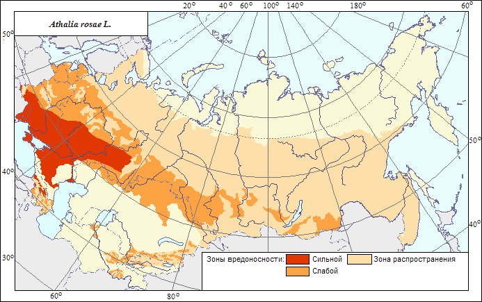 Athalia rosae L.Рапсовыйпилтьлщик- Тело взрослого насекомого длиной 7-8 мм, блестящее, ярко-оранжевого цвета, за исключением черных головы и боков спины. Две пары крыльев с желтой окраской при основании, по переднему краю и в наружной половине - черные. Птеростигма черная. Щиток и средние лопасти среднеспинки красные, средне- и заднегрудь снизу желтые. Сверху на груди два ромбовидных черных пятна. Брюшко толстое, у самок заостренное, у самцов - закругленное. Голова и 11-члениковые утолщенные на вершине усики - черные. Яйцо крупное, овальное, прозрачное, стекловидное. Куколка длиной 6-11 мм, желтоватая, помещена в бурый цилиндрической формы кокон. Ложногусеница длиной 18-25 мм, темно-бархатная или зеленовато-серая, с черной головой и 11 парами ног цилиндрической формы. Брюшная сторона более светлая, по бокам и на спинной стороне темно-бурые полосы. Тело морщинистое, усеянное мелкими бородавками. Зимует ложногусеница в почве внутри кокона на глубине 7-15 см. Там же в апреле окукливается. Стадия куколки длится 8-15 дней. Лёт взрослых особей первого поколения отмечается в мае - начале июня. Самки и самцы дополнительно питаются на культурных и диких растениях, преимущественно из семейств крестоцветных и зонтичных. Вскоре происходит спаривание и откладка яиц. Самка при помощи яйцеклада делает надрезы в листовой мякоти растений и откладывает в эти отверстия под эпидермис по одному яйцу. Яйцекладка продолжается 20-30 дней, в течение которых самка откладывает 200-300 яиц. В местах откладки яиц наблюдаются легкие вздутия. Длительность эмбрионального периода - 5-12 дней. Самка живет около трех недель. Вылупившиеся личинки грубо объедают мякоть листа, оставляя толстые жилки и черешок. Поедаются также цветки, завязи, мелкие плоды, вследствие чего последние опадают. Ложногусеницы живут 15-20 дней. За это время 4-5 раз линяют, то есть проходит до 6 возрастов. Взрослая ложногусеница проникает в почву, где происходит окукливание. Личинки второго поколения отмечаются в июле-августе.