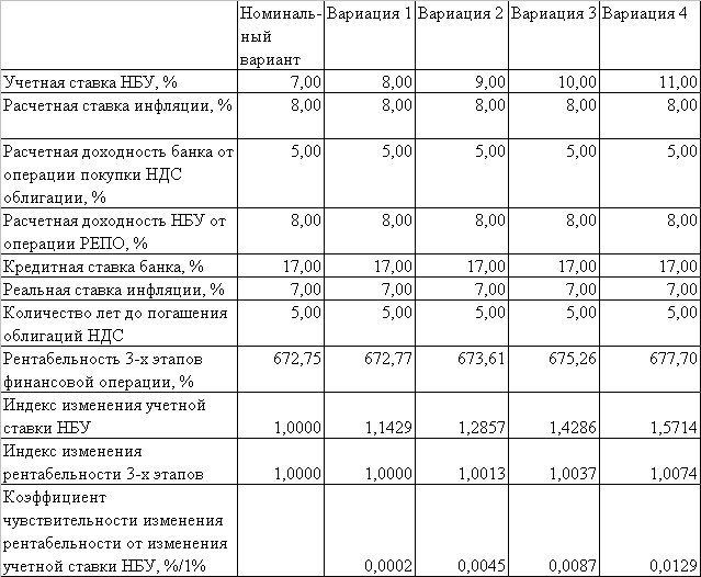 Таким образом, основной риск потери рентабельности 3-х этапов финансовой операции за счет изменения параметров РЕПО-операции возникает за счет увеличения ставки доходности РЕПО-операции, закладываемой НБУ при рефинансировании под облигации.