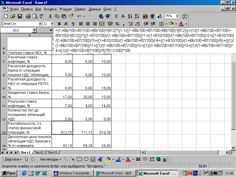 В дипломном проекте проанализирована эффективность использования облигаций НДС коммерческими банками при 3-х этапной долгосрочной финансовой комбинации с использованием производных ценных бумаг – РЕПО-контрактов(операций обратного выкупа собственных ценных бумаг, заложенных до момента погашения под заемные кредитные ресурсы):