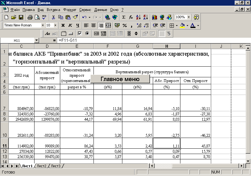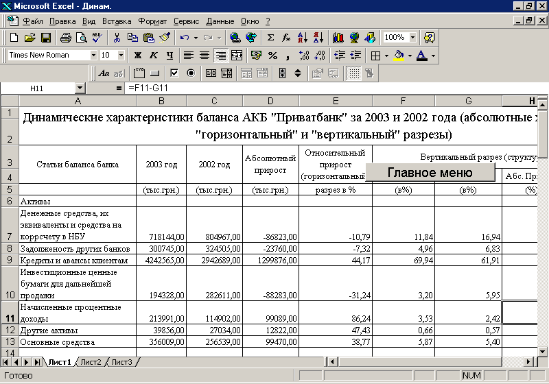 Как показали “горизонтальный” и “вертикальный” анализы динамики статей баланса и отчета о финансовых результатах АКБ “Приватбанк” за 2001 и 2002 года, а также отчетный баланс банка за 31.12.2003 года :