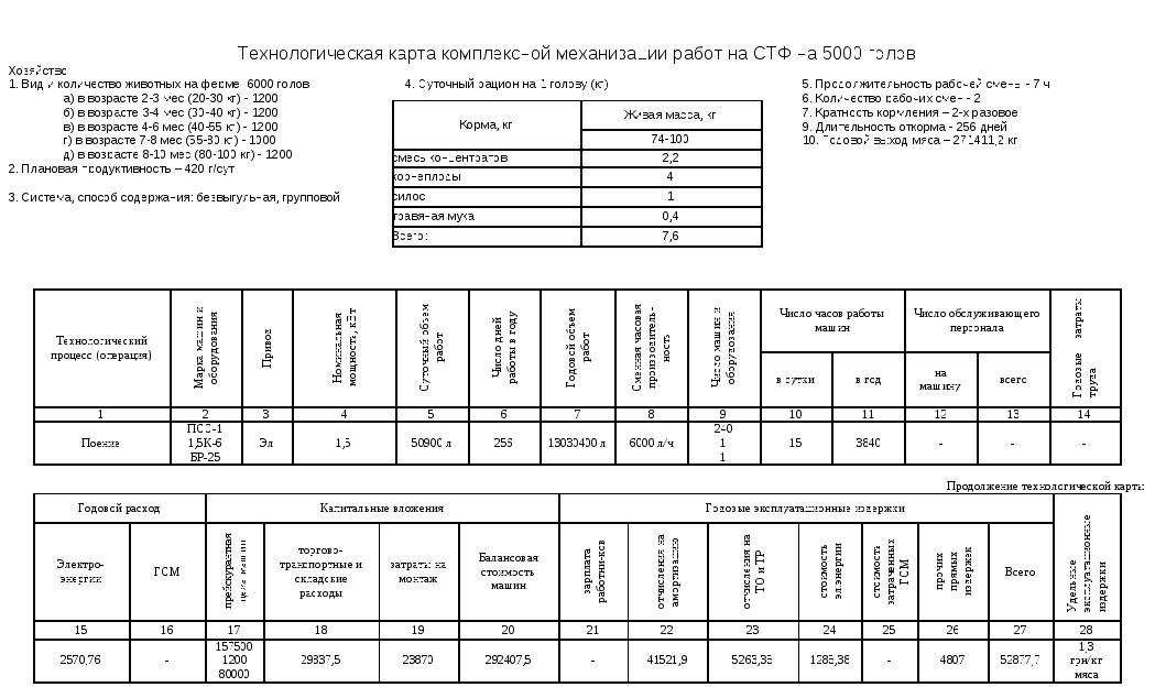 Графа 5 – объем работ в сутки – заполняют для каждой операции с учетом суточных норм кормления, расхода подстилки, выхода навоза, количества продукции, времени на выполнение операции в соответствии с принятым на ферме распорядком дня. 50900 л.