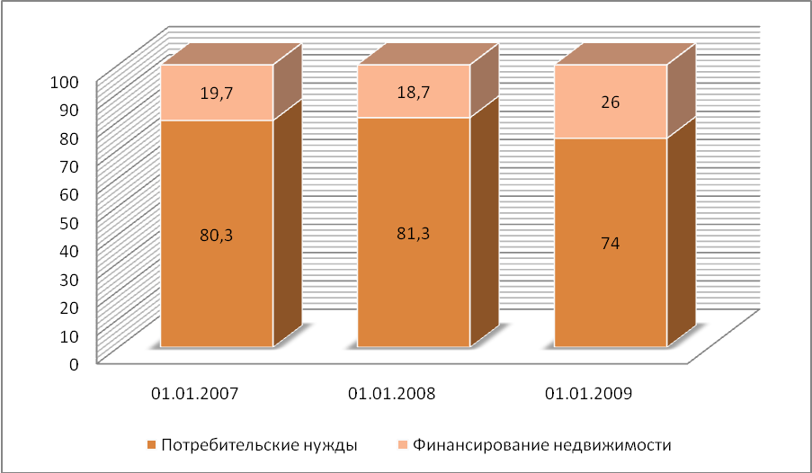 2. Кредитование на потребительские нужды также развивалось довольно быстрыми темпами – увеличение составило 168,6% или 8852,9 млн. руб. за анализируемый период. Удельный вес данной статьи является лидирующим среди кредитования населения и по состоянию на 01.01.2009г. составил 74%.