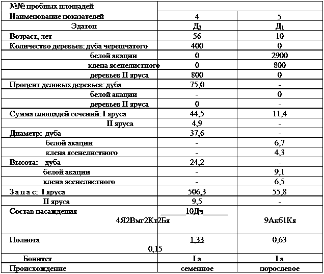 Лесополоса, где в качестве главной породы произрастает дуб черешчатый, шириной 48 м расположена в нижней части балки и играет одновременно роль и полезащитную, и водорегулирующую. В наиболее продуктивной её части заложена пробная площадь. Результаты исследований на стационарах даны в таблице 2.