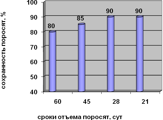 Исследованиями И. Ступака, Л. Привало (1977) установлено, что при отъеме поросят в 30 дней живая масса в 60 дней была на 1,4-1,8кг ниже, чем у аналогов, подсосный период которых составлял 2 месяца.