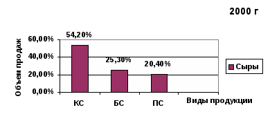 Также в курсовой работе проведен анализ выполнения плана по ассортименту продукции, и, можно сказать, что по колбасным и брикетным сырам идет перевыполнение на 10 % и 6,5 % соответственно. И только по пастообразному сыру идет недовыполнение плана на 2,7 %. В целом план по ассортименту продукции в 2000 году выполнен на 99,4 %