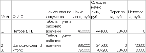 Следующим этапом является проверка табелей учета рабочего времени. Здесь установим, что случаев включения в них вымышленных (подставных) лиц нет, так как в нарядах и табелях учета рабочего времени фамилии совпадают с данными учета личного состава. Случаев повторного начисления сумм по ранее оплаченным первичным документам, повторения одних и тех лиц в нескольких расчетно-платежных ведомостях не обнаружено.