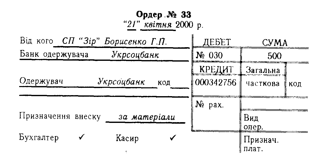 виписка бухгалтерією на кожну окрему касову операцію прибуткових і видаткових ордерів, додержання послідовності в нумерації та реєстрації цих коштів у реєстрі й передачі їх для виконання касирові;