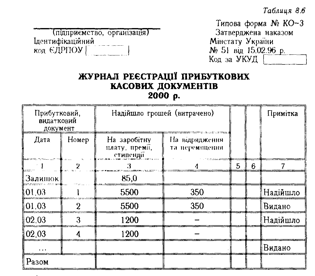 Касир, що одержав з бухгалтерії касові ордери, повинен перевірити правильність їх оформлення, наявність і дійсність підписів, додатки, перераховані в ордері. Після цього він приймає або видає гроші. Особі, що внесла гроші до каси, видається квитанція. При видачі грошей за видатковим касовим ордером окремій особі касир вимагає пред'явлення документа, який посвідчує особу одержувача. Таким документом є паспорт, закордонний паспорт, військовий квиток, службове посвідчення за наявності на ньому фотокартки Ти особистого підпису власника. Прибуткові касові ордери і квитанції до них, а також видаткові касові ордери заповнюються бухгалтерією чітко й зрозуміло, без будь-яких підчисток, помарок або виправлень. Прибуткові й видаткові касові ордери до передачі в касу реєструються бухгалтерією в Журналі реєстрації касових ордерів (табл. 8.6), де їм надаються порядкові номери. Касир усі надходження і видачі готівки за прибутковими і видатковими касовими ордерами обліковує у Касовій книзі.